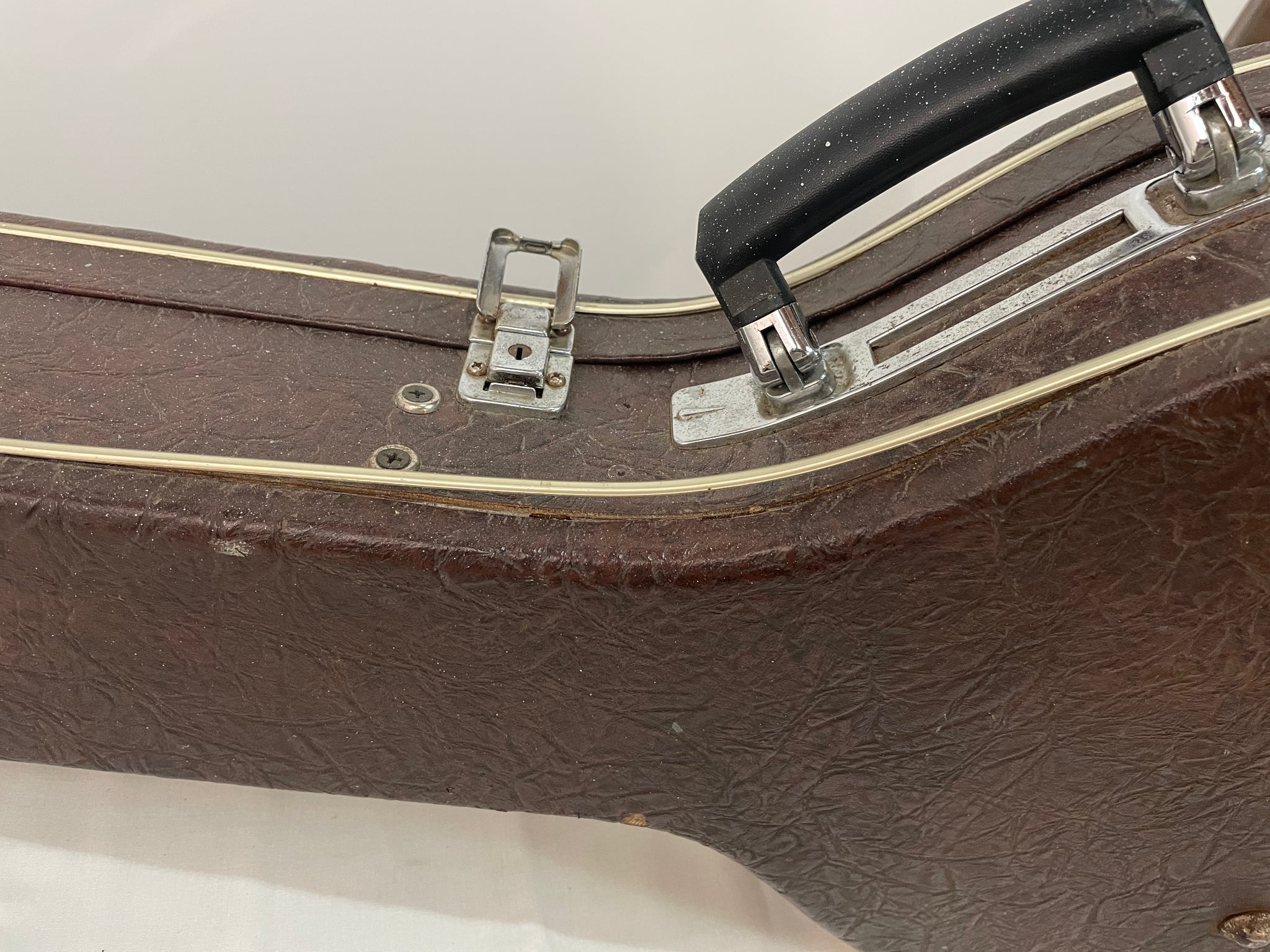 This is a used tenor banjo case with brown leather like covering. The plastic cording has pulled away in 2 spots.