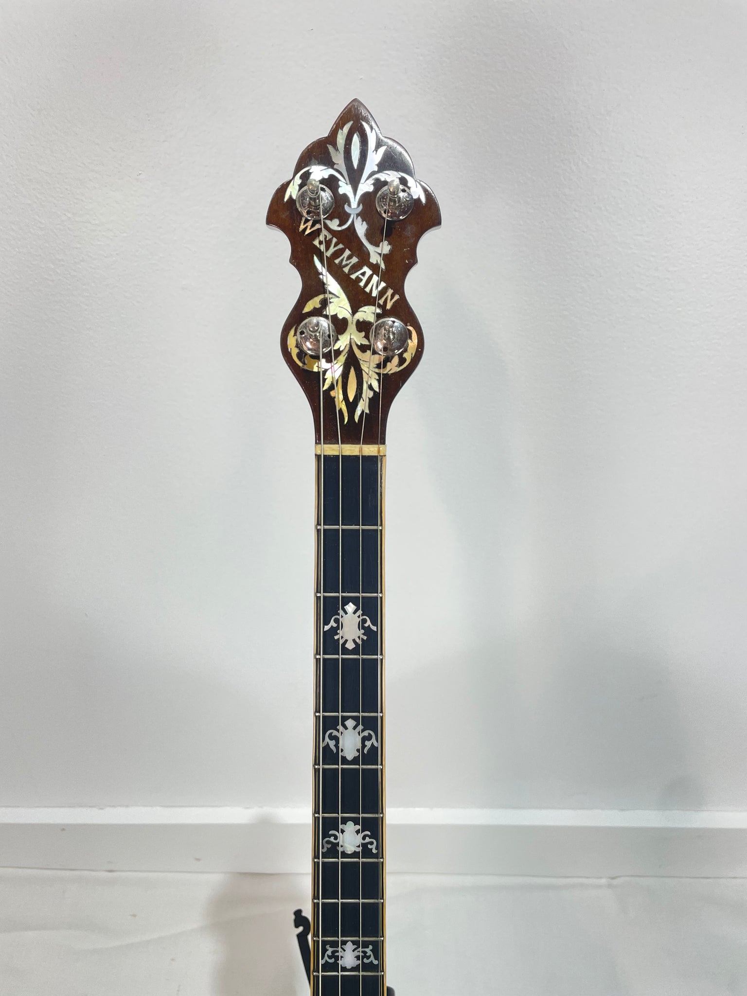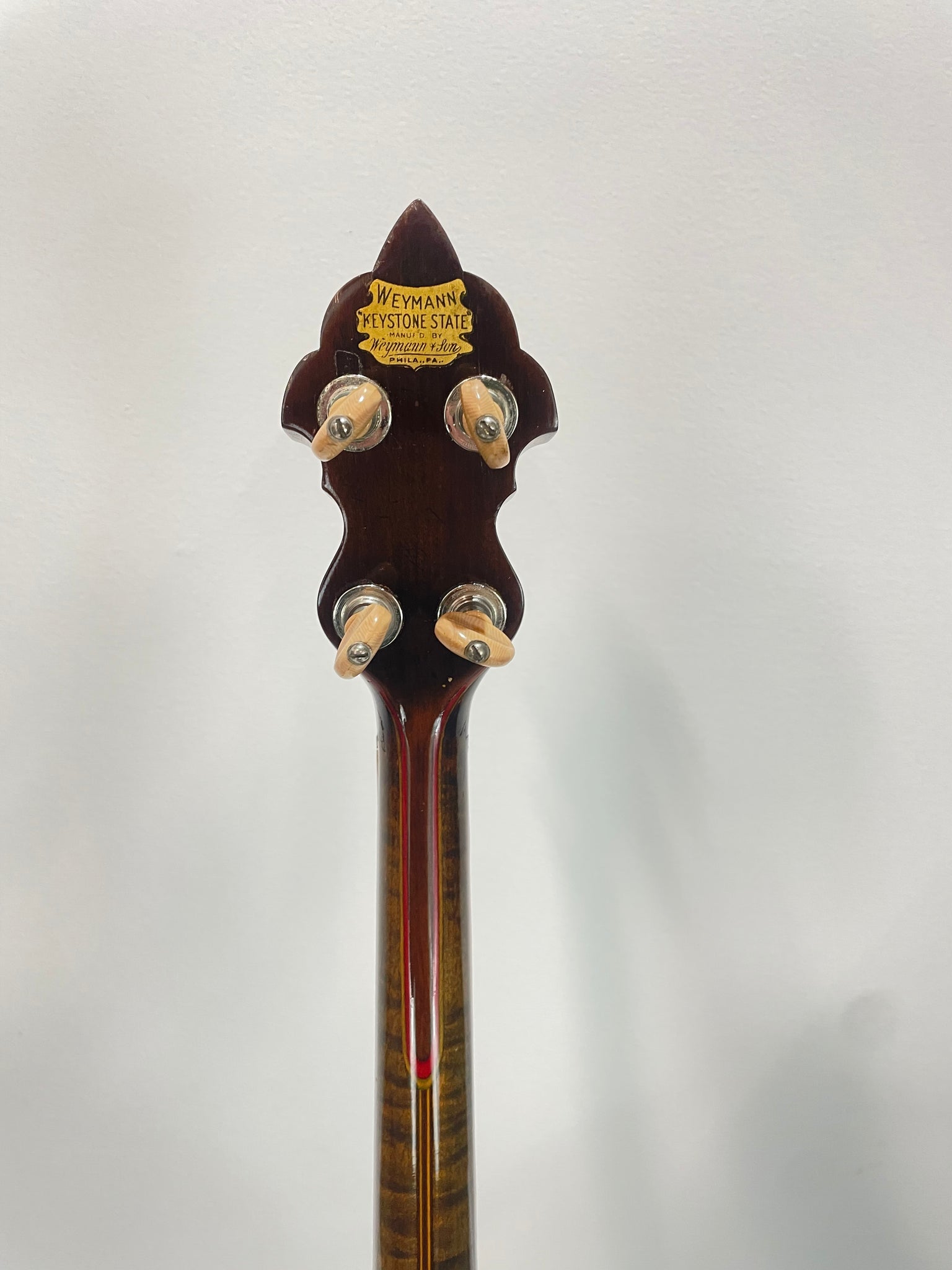 Neck - is made from maple with a two-tone brown and gray finish. It has and extended ebony fingerboard with 7 mother of pearl inlays, the standard Weymann Orchestra design inlaid with pearl on the peghead, and multi-colored underlays.