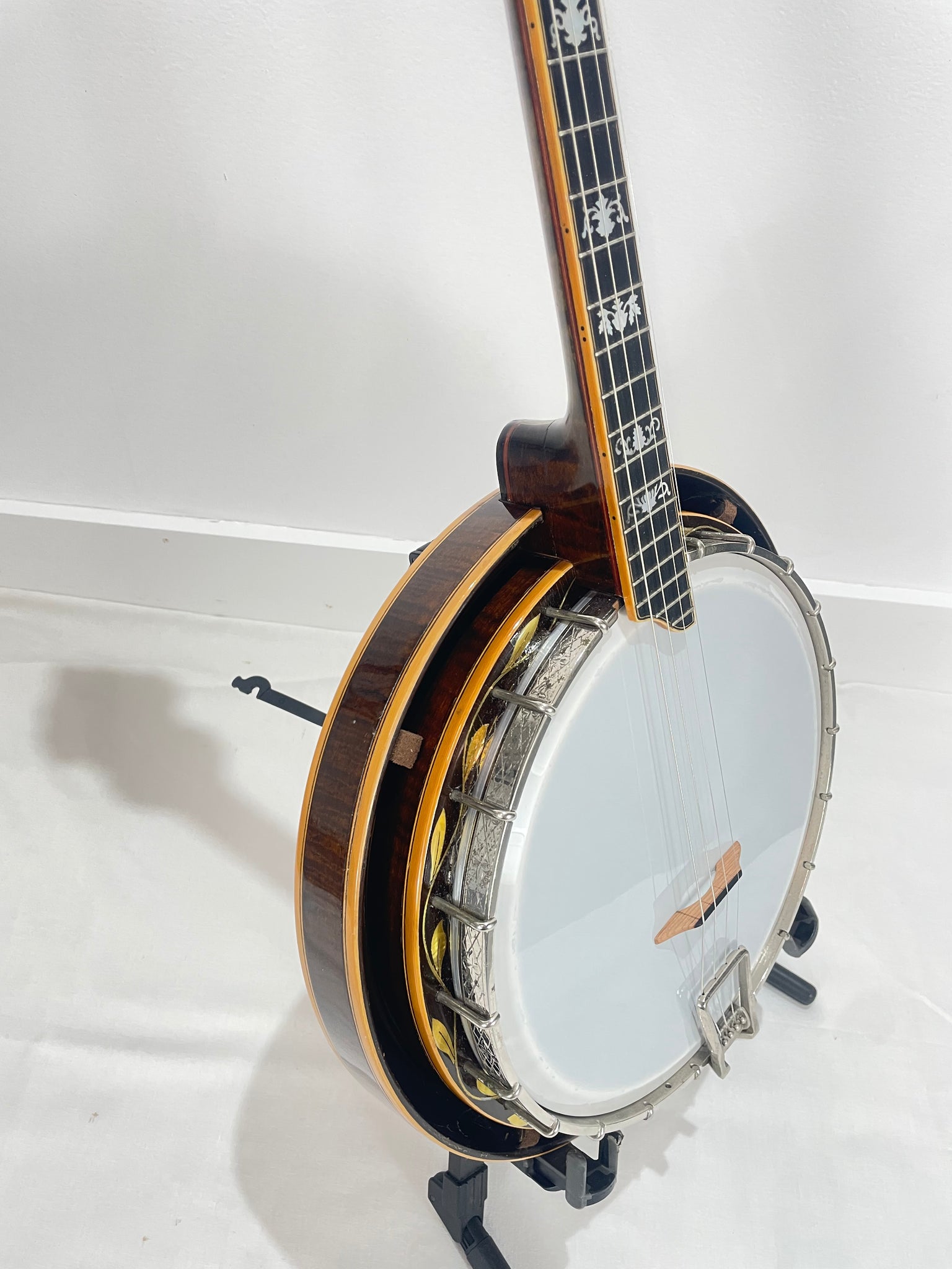 Notes - This banjo has a repaired heel crack on one side and a repaired crack on the resonator (see photos). The neck is straight with minimal relief and the frets are in very good condition. It has a custom Trad Banjo bridge installed. The action is low and plays great. It includes the original armrest that was not pictured. There is some corrosion on some of the hooks. There are chips and crazing on the resonator.