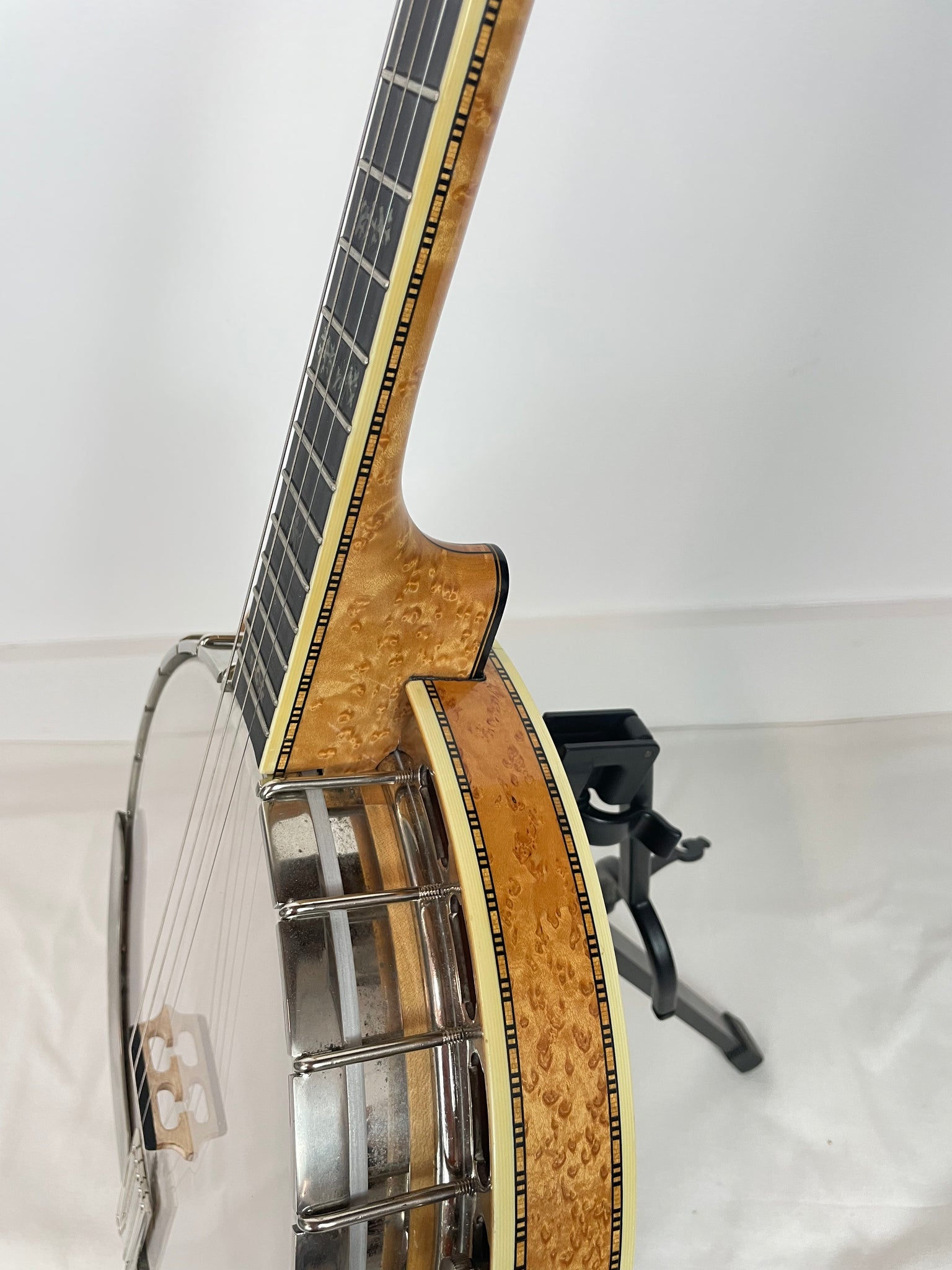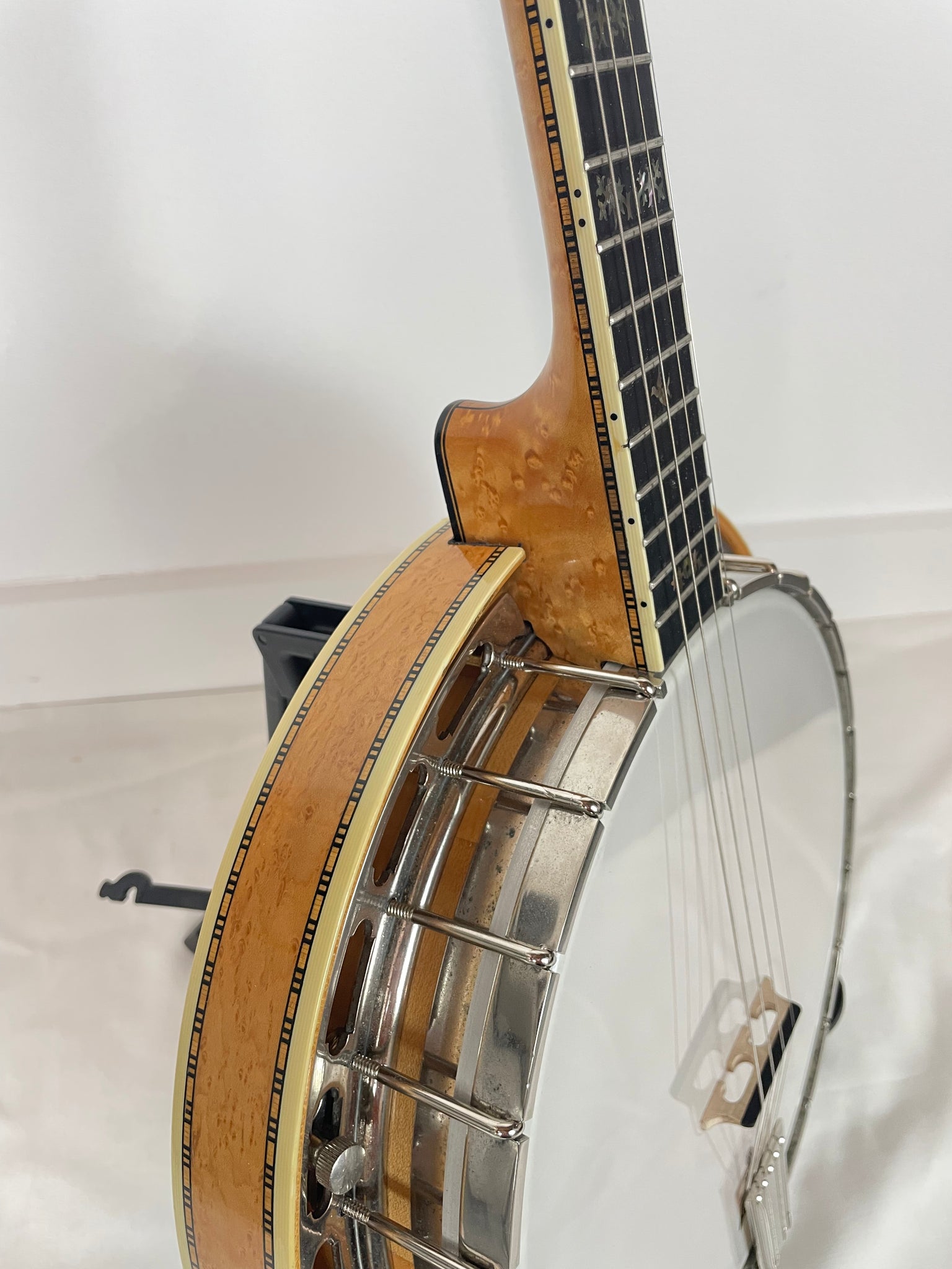 Notes - This is a heavy and powerful banjo, that is the way Wildwood built them with the thick block rim and best woods he could use. There is a small chip on the top of the peghead veneer (above the i in Wildwood), which can be repaired if requested, there is a small crack on the back of the heel that is stable and not one that I fear would be an issue in the future because of the mass of the wood in that area. Close inspection in the right lighting shows some dents and scratches on the back of the resonator. The nickel is worn on the armrest. Frets show little to no wear. Wildwood nut width is a little wider than most, but the neck is shallow and they play easily with a very low action. I currently play a similar Wildwood.