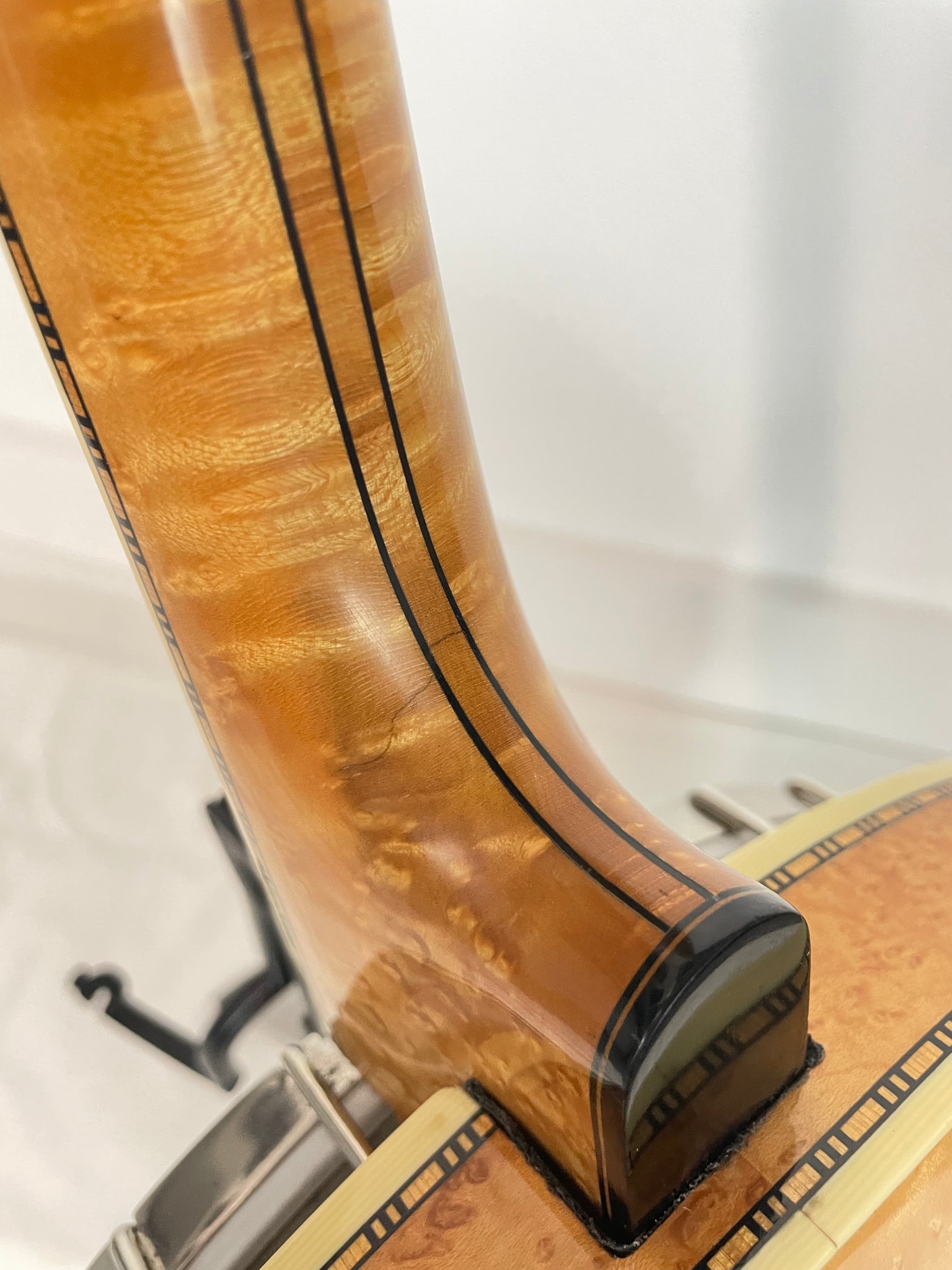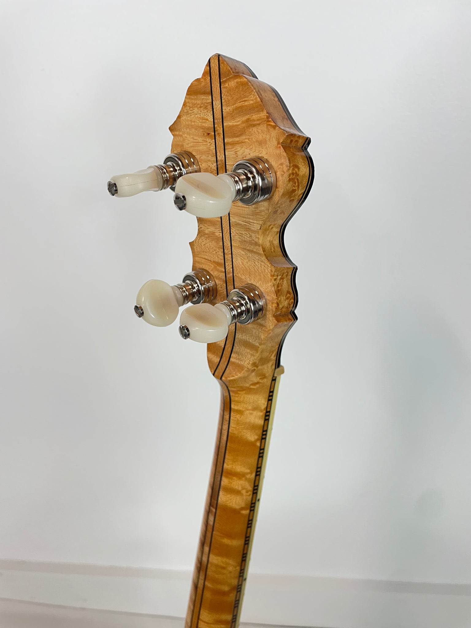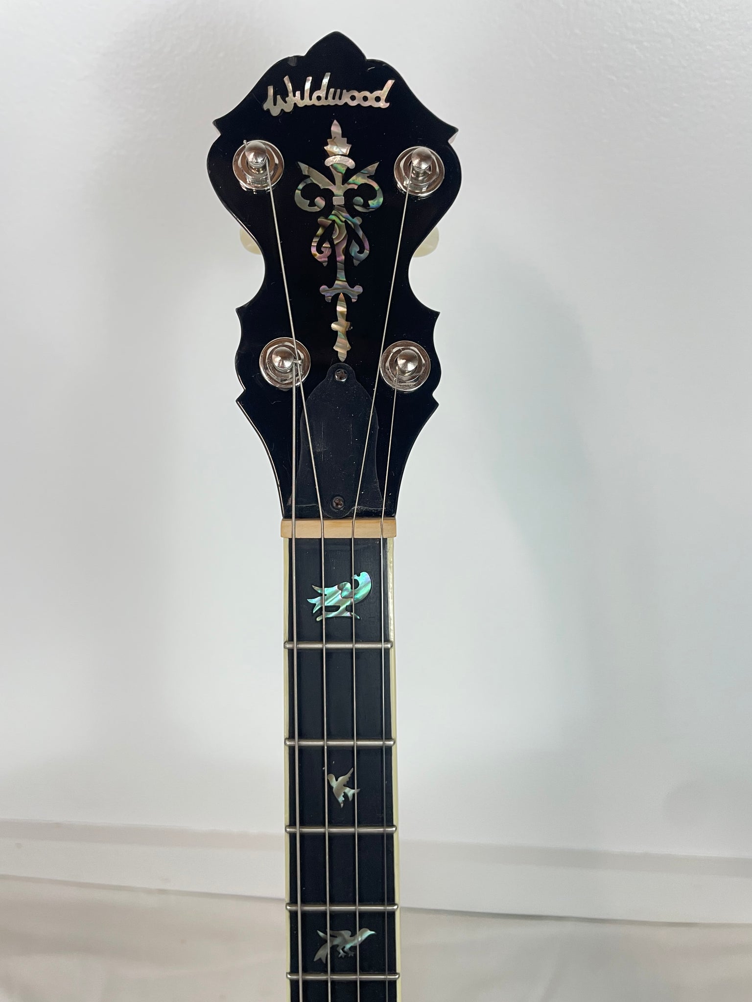 Neck - The neck is nicely figured birds-eye maple with a 3-piece center stripe, thick ebony fingerboard with his bird motif mother of pearl inlays, ebony peghead veneer with the standard Wildwood mother of pearl inlay design.