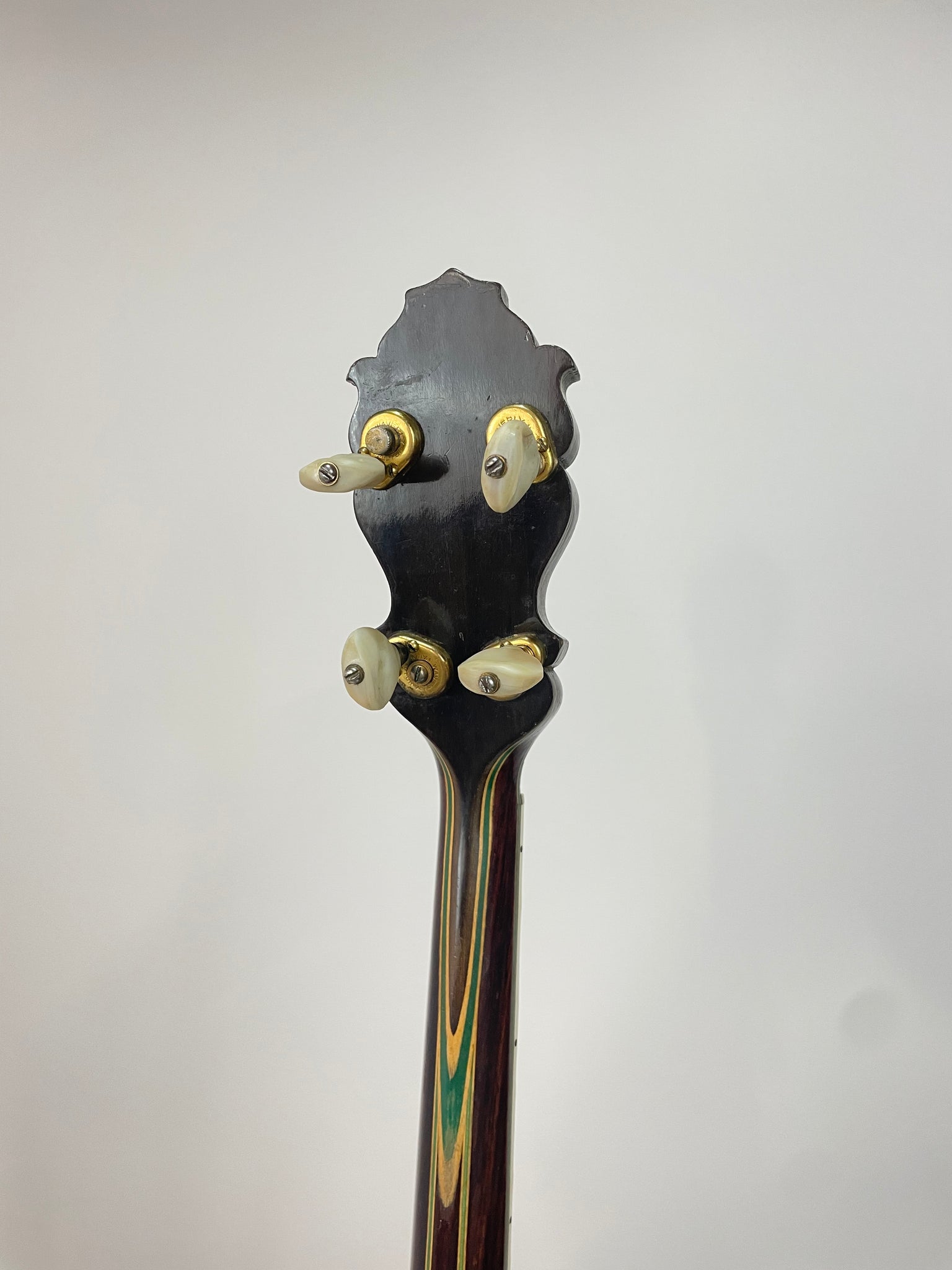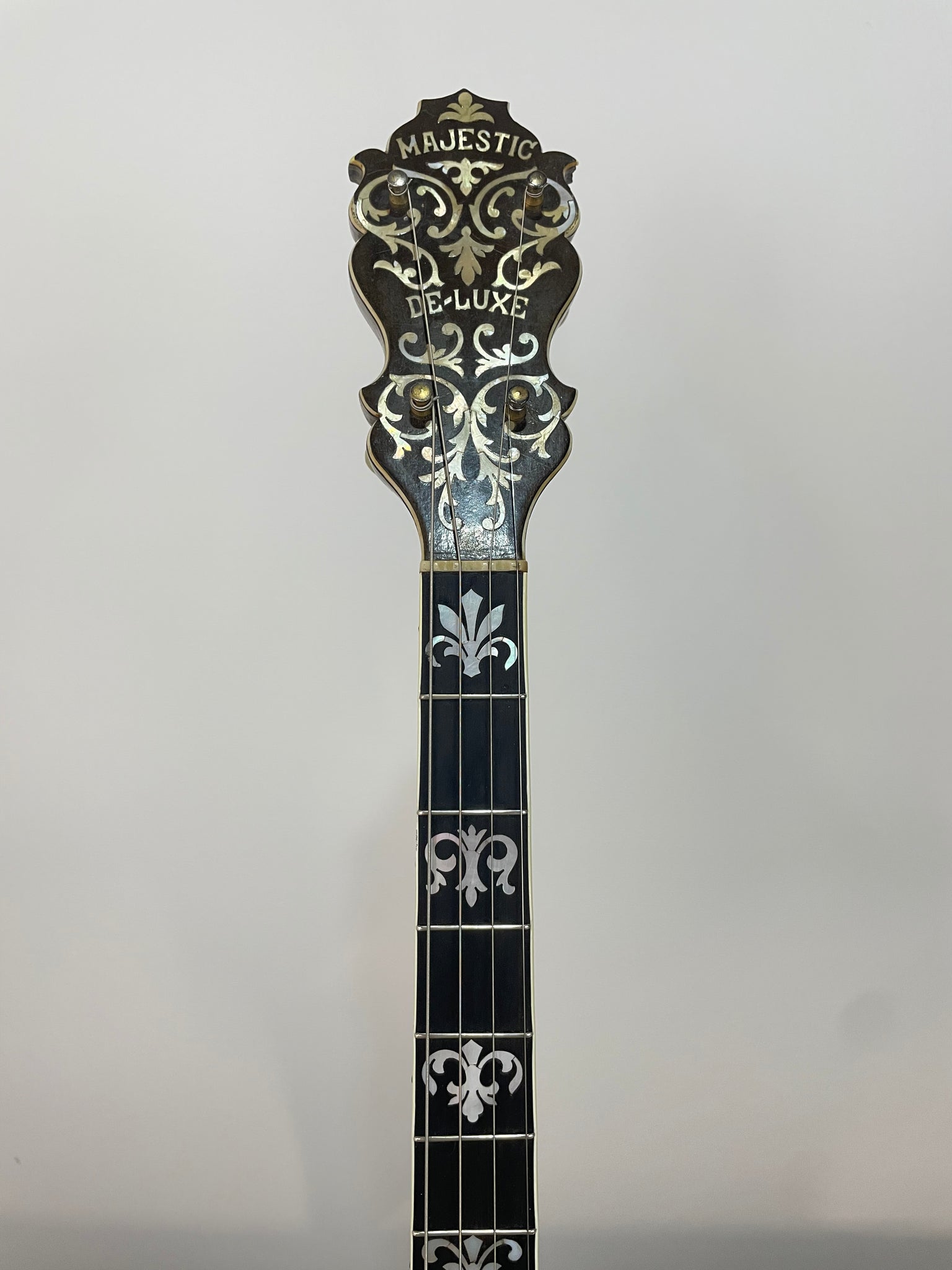 Neck - made from Brazilian rosewood with 2 3 piece laminations and a multi colored back strap. The fingerboard is ebony and features 8 mother of pearl inlays. The peghead also has elaborate mother of pearl inlays and the Majestic De-Luxe inlay. The orginal gold plated tuners have mother of pearl buttons.