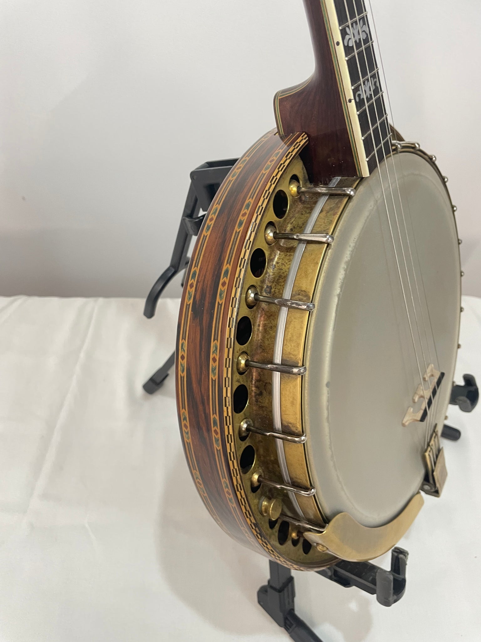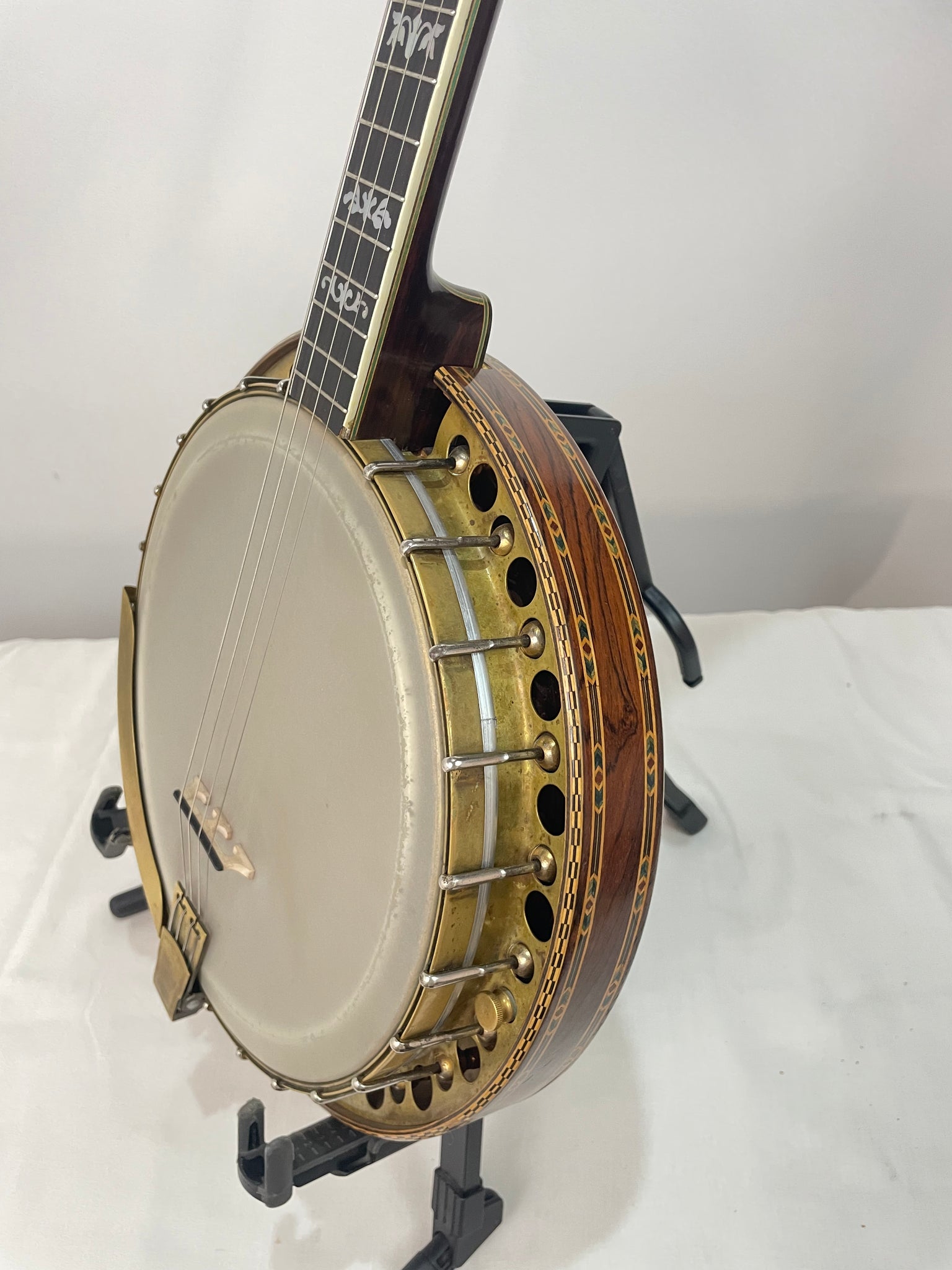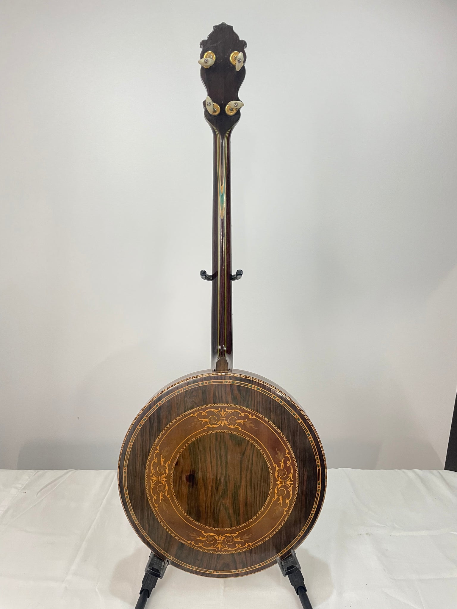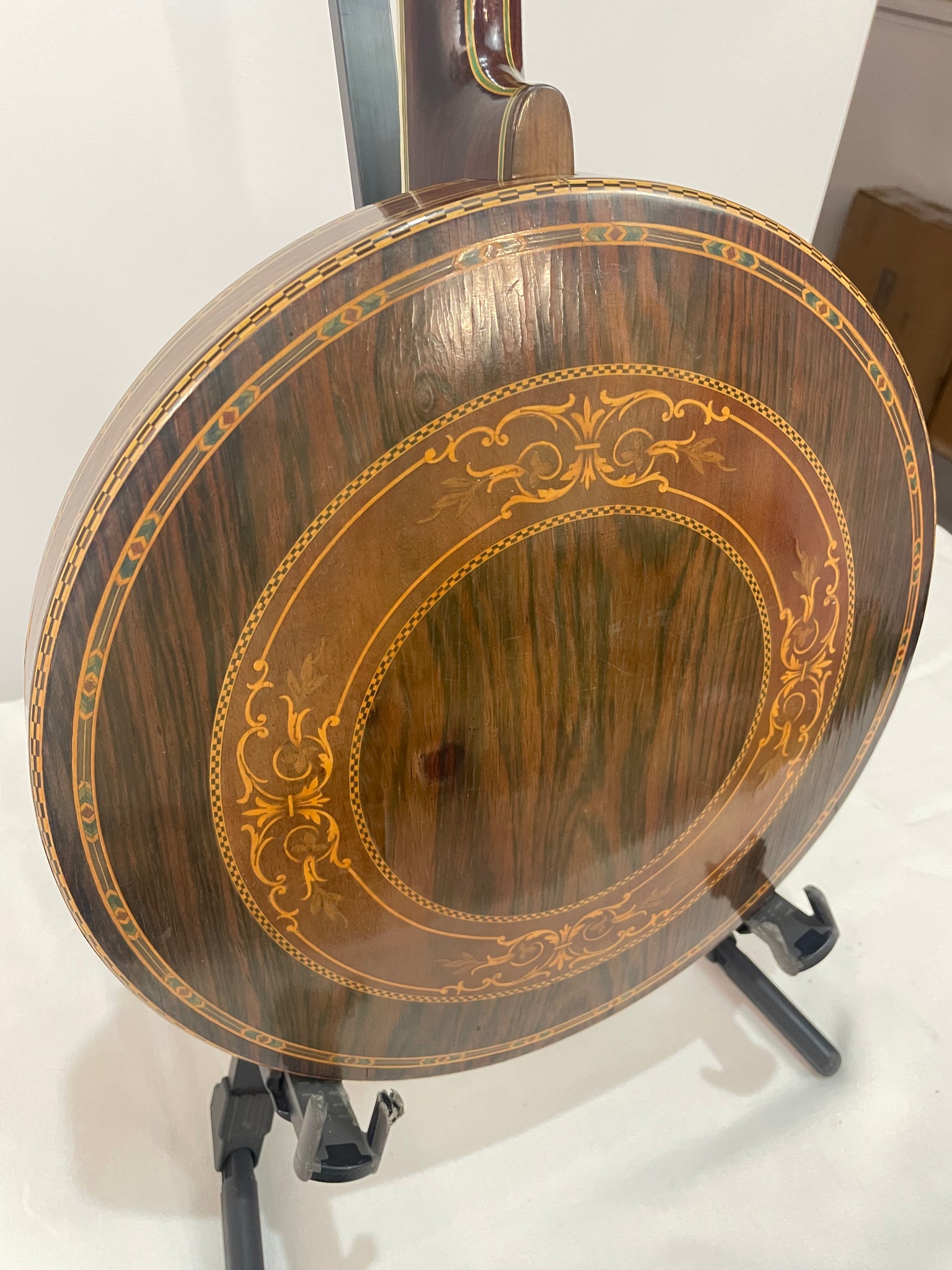 Rim - is made of a multi ply maple with Brazilian rosewood veneer with the tone ring as described above. The resonator is also Brazilian rosewood with multi-wood marquetry, purfling, and bindings.