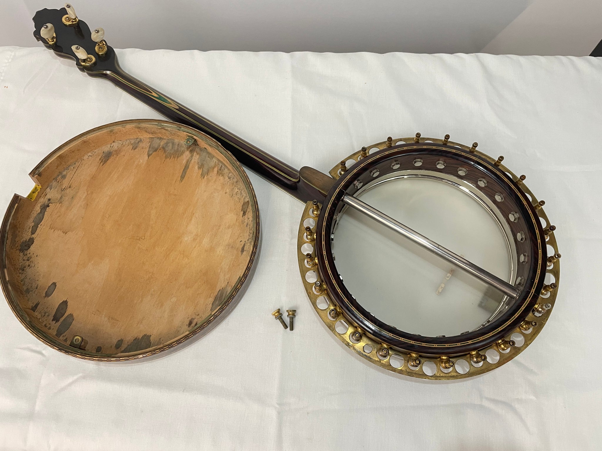 This is one of the best vintage banjos for Irish Trad. This Majestic Deluxe was built by Gaetano Francesco “Thomas”Puntolillo of New York City and later Lyndhust NJ. The Majestic line of banjos are often listed with a tone ring patent of June 29,1920. In my research I have discovered 17 different tone ring configurations in Majestic banjos. This banjo features the tone ring design using round brass ring which sits on studs on top of a thick flat brass bar.