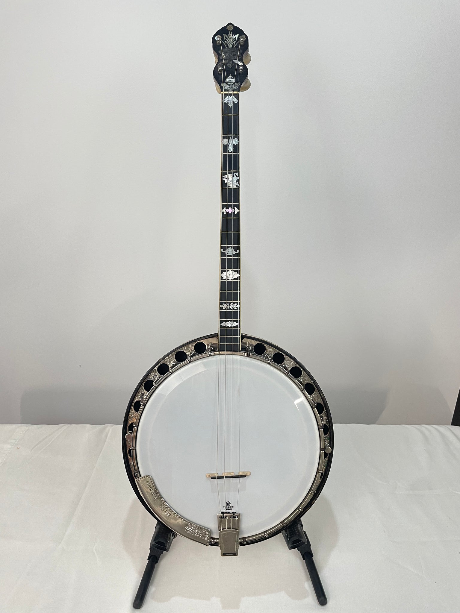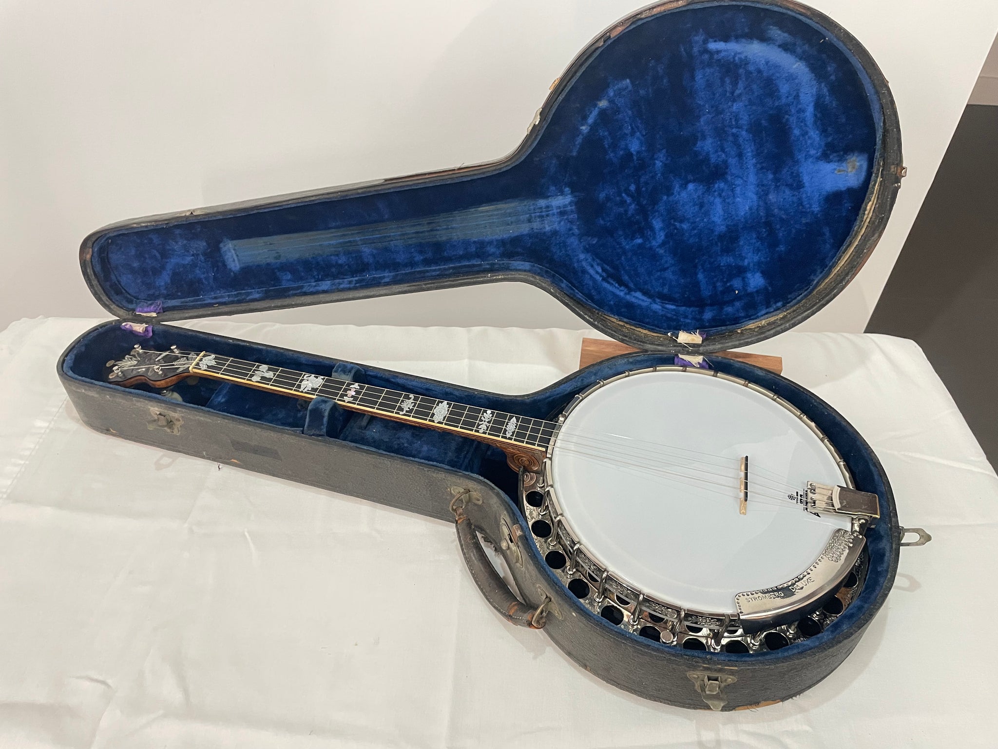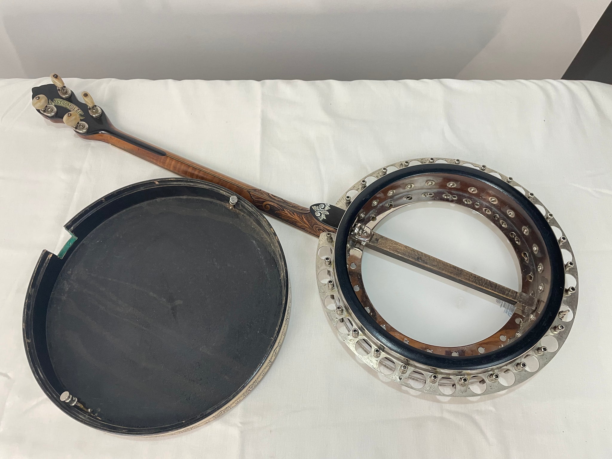 THIS BANJO IS ON HOLD - This is a Stromberg DeLuxe built by Charles A. Stromberg in Boston, Mass. in the 1920's. Stromberg was a small builder with only a few employees and is best know for the Cuppophone tone ring which feature round "sockets" brazed to a metal base with a round brass ring sitting on top.