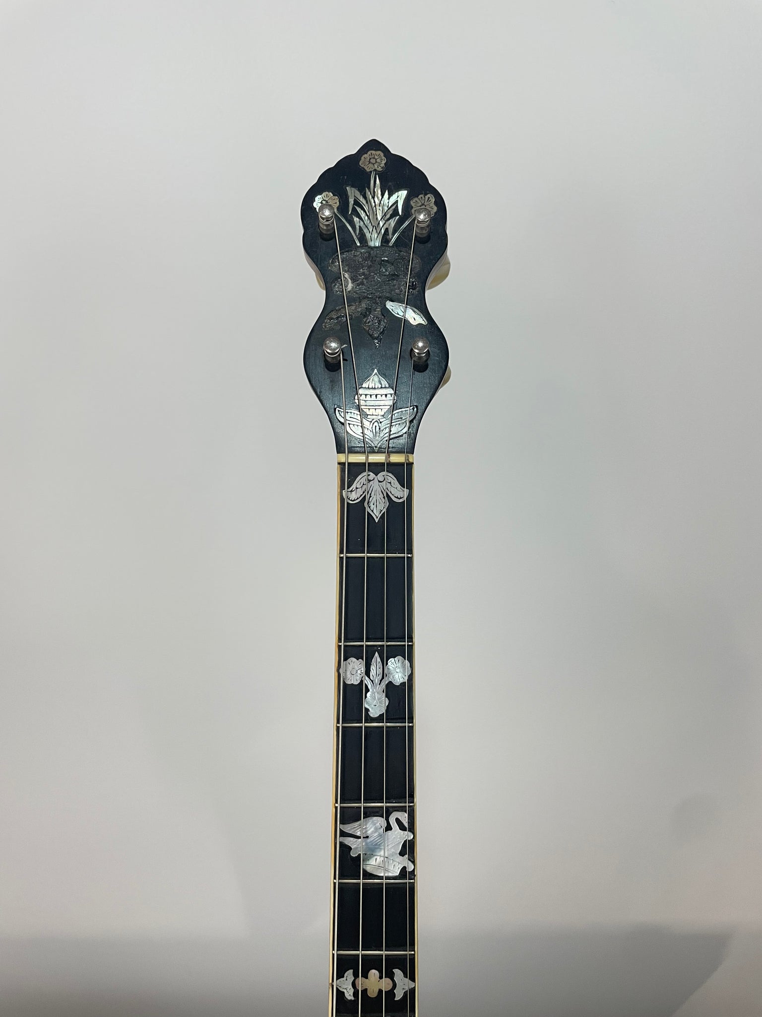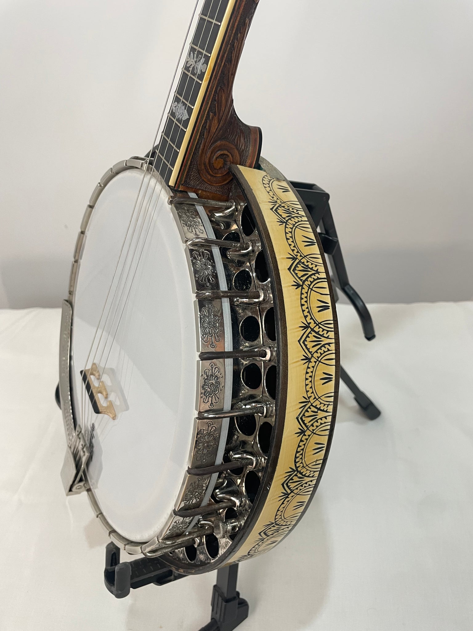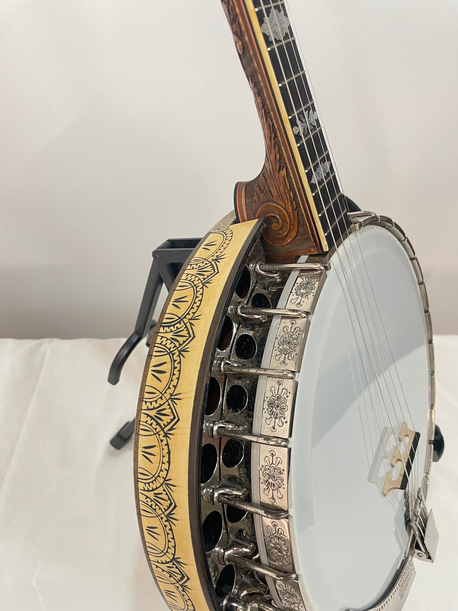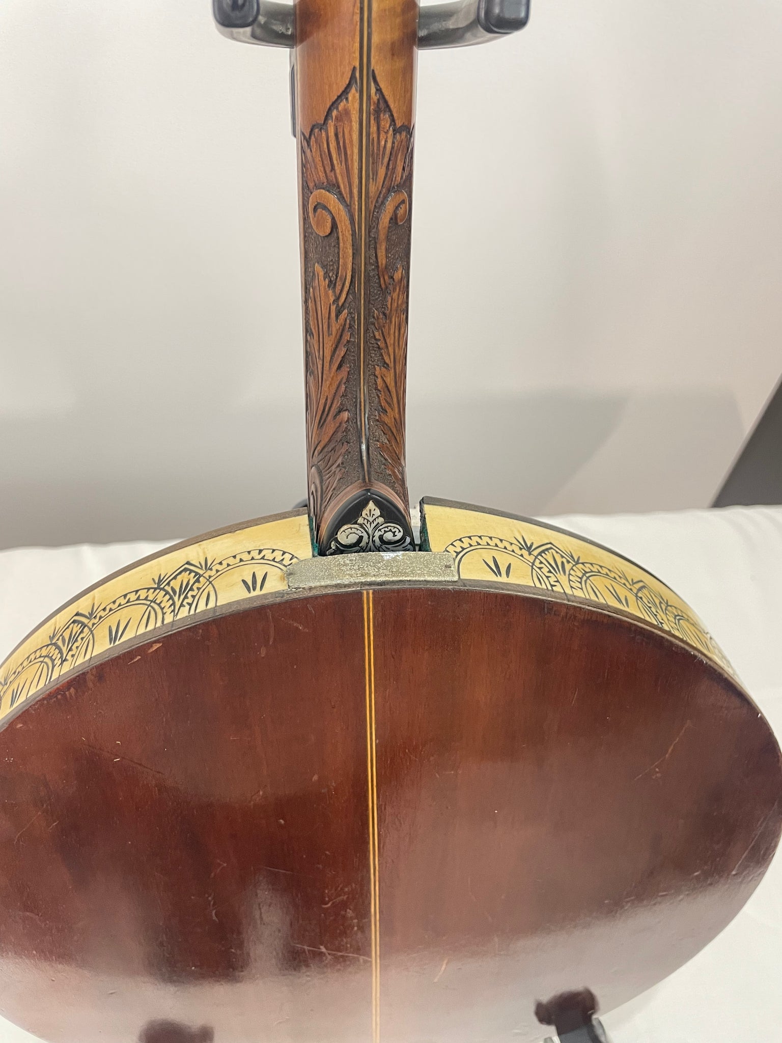 Notes - This is a great banjo and was my "main player" for 4 or 5 months last year. The neck on this banjo is very narrow from the nut to the heel and is easy to play. There is a little relief but does not affect anything. There is missing inlay on the peghead. The dowel stick was replaced prior to me owning this. There are also grooves beside some of the frets from previous fret work.